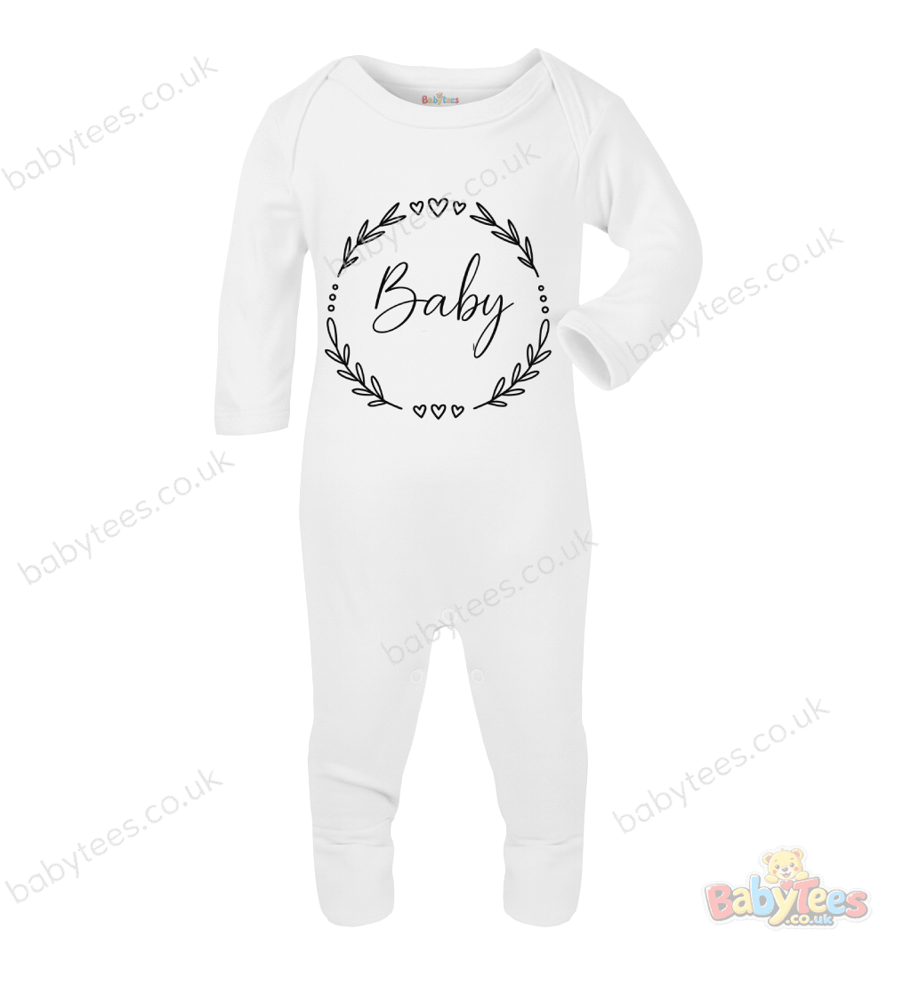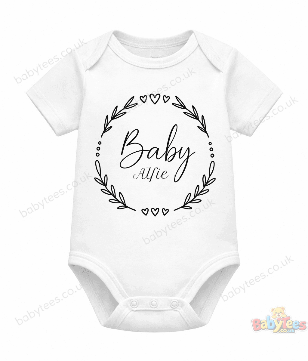 Celebrate your little one’s arrival with this beautifully designed “Baby [Name] • [Year]” bodysuit, featuring a delicate leafy wreath and heart accents. Whether it’s for a newborn photo shoot, a baby shower gift, or a keepsake to treasure, this personalised outfit adds a touch of elegance to any moment.
