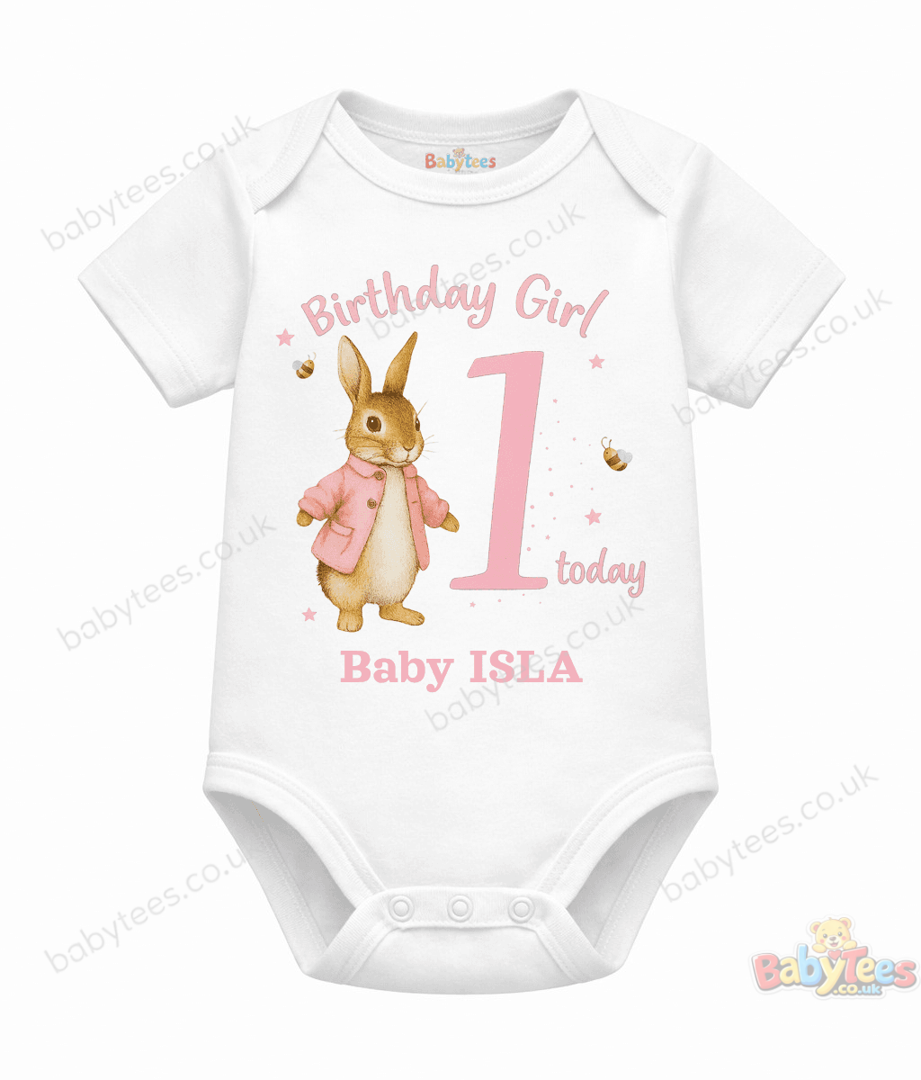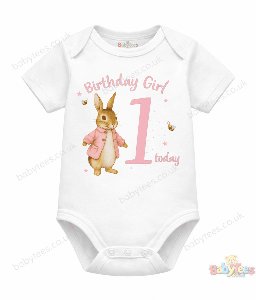 birthday girl 1 today baby bodysuit featuring a sweet bunny 🐰 in a pink coat surrounded by stars 🌟, buzzing bees 🐝, and soft pink confetti 🎀 — all celebrating her big milestone.