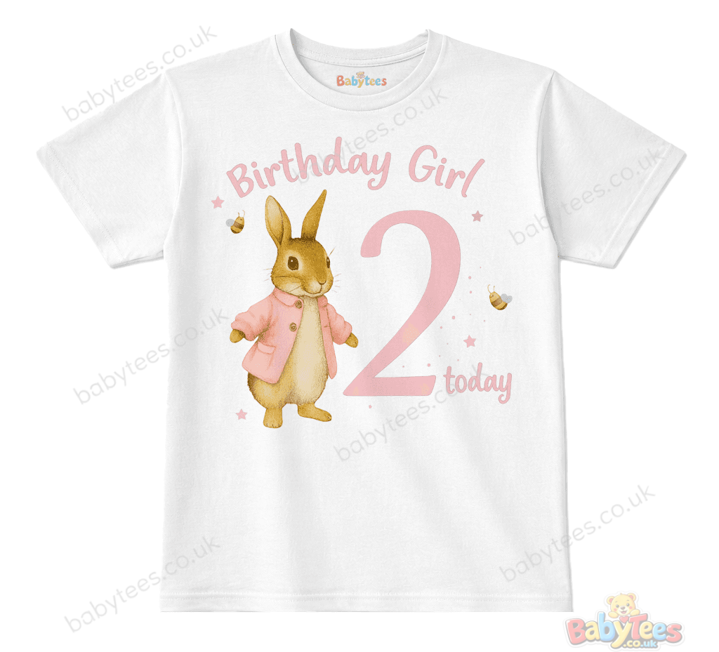 birthday girl 2 today tshirt featuring a sweet rabbit 🐰 in a pink coat standing beside a large pink number 2 — surrounded by cheerful stars 🌟 and buzzing bees 🐝 for a playful, celebratory feel.