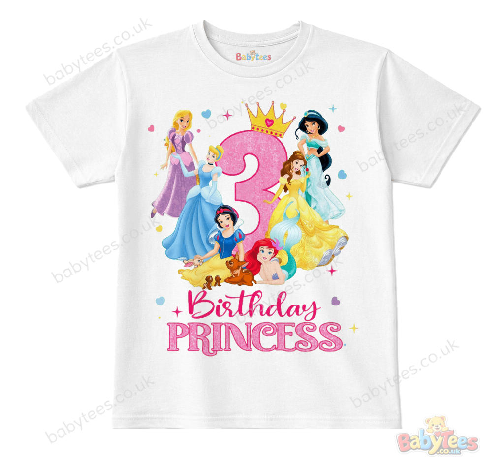 birthday princess 3 today tshirt featuring a glittery pink “Birthday Princess” layout 👑 with a large number 3 topped by a golden crown — surrounded by a group of colourful fairytale princess characters 👸 in a bright, celebratory style.