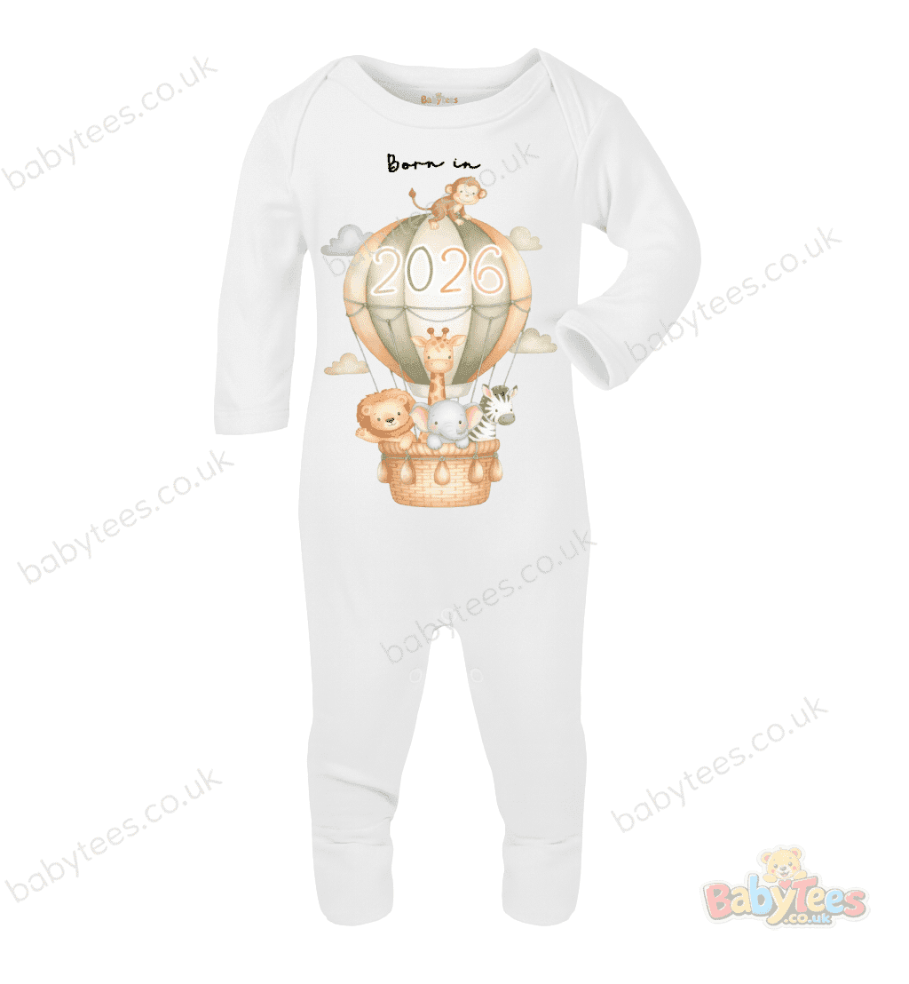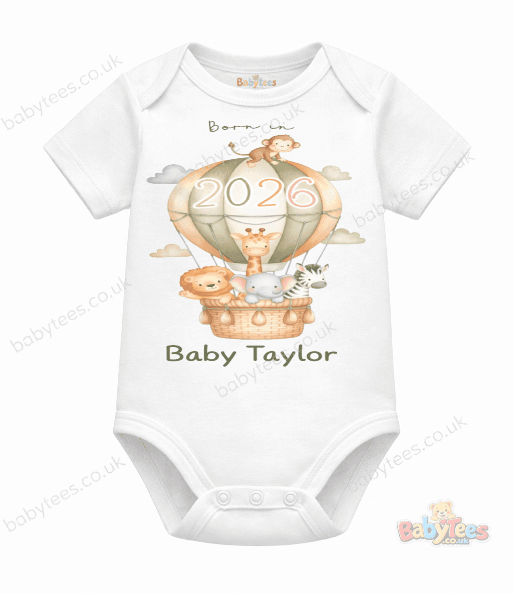 Adorable Personalised Baby Sleepsuit Born in 2026 – Safari Hot Air Balloon Design