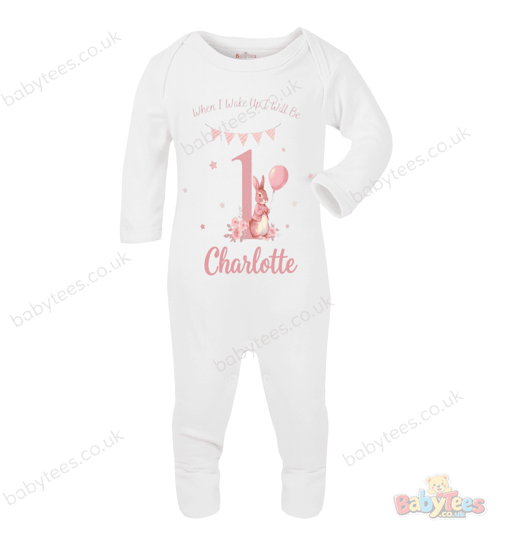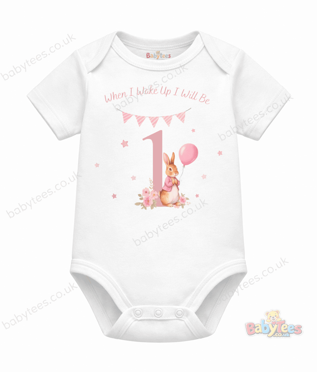 personalised baby bodysuit first birthday designs are perfect for celebrating your little one’s big milestone. This adorable outfit features a cute bunny sitting beside a floral number “1”, pink bunting, stars and soft pastel details, paired with the phrase “When I Wake Up I Will Be 1”.