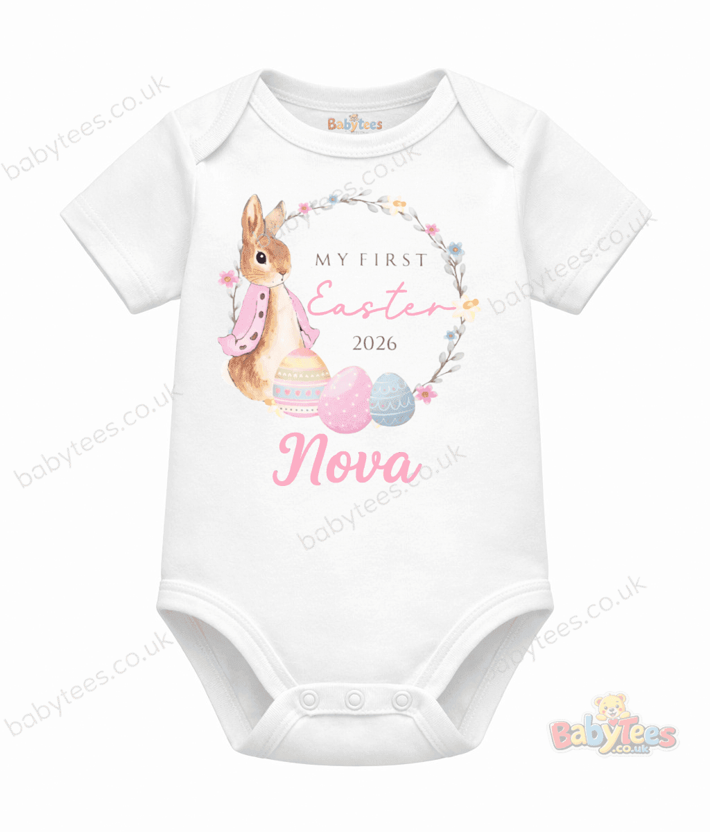 personalised baby sleepsuit first easter designs are perfect for celebrating your little one’s first springtime milestone. This beautiful sleepsuit features a watercolour bunny surrounded by a floral wreath and pastel Easter eggs, with “My First Easter 2026” displayed in the centre.