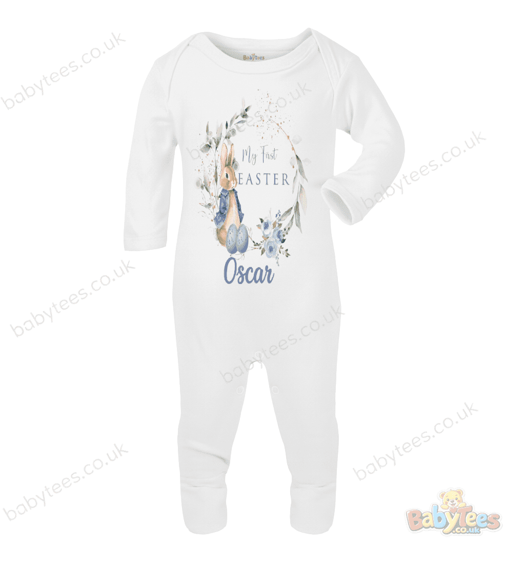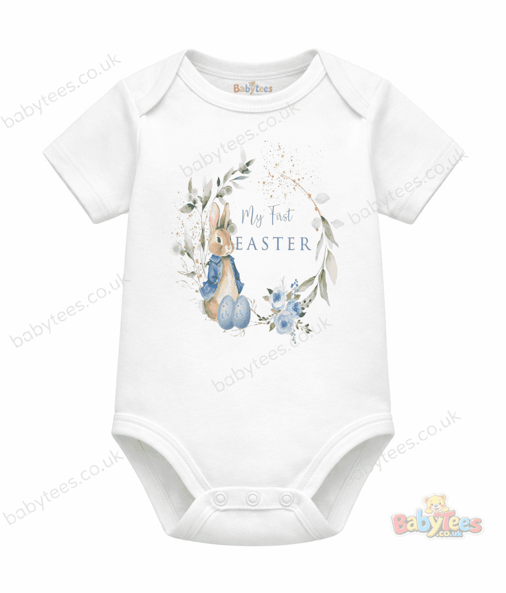 personalised baby bodysuit first easter designs are perfect for celebrating your little one’s first springtime milestone. This adorable outfit features a sweet bunny in a blue jacket, surrounded by pastel Easter eggs, blue florals and soft greenery, with “My First Easter” displayed above.