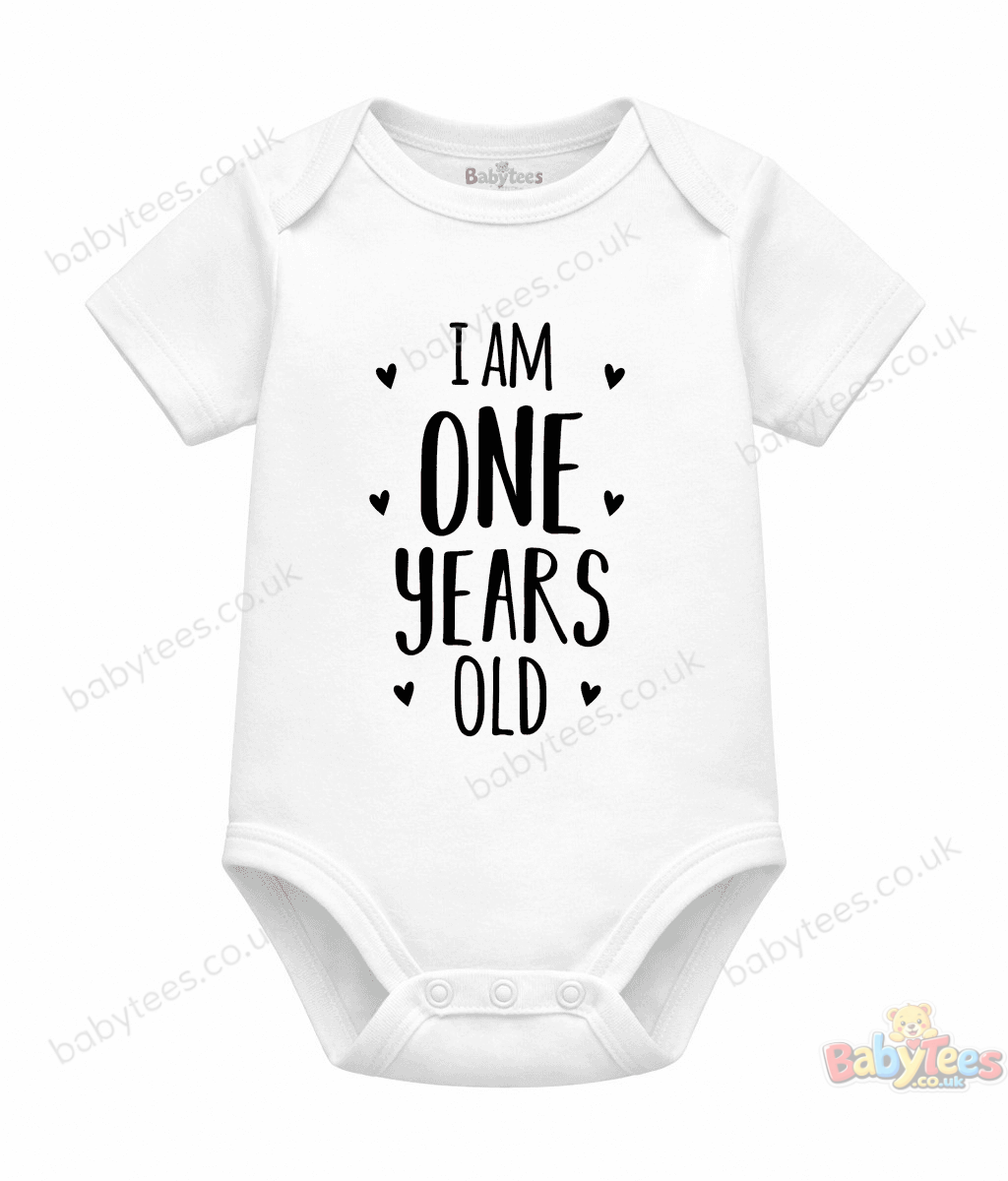 Baby bodysuit featuring a playful “I AM ONE YEARS OLD” milestone design with heart borders and math-inspired visuals — perfect for celebrating your little one’s first birthday with love and learning.
