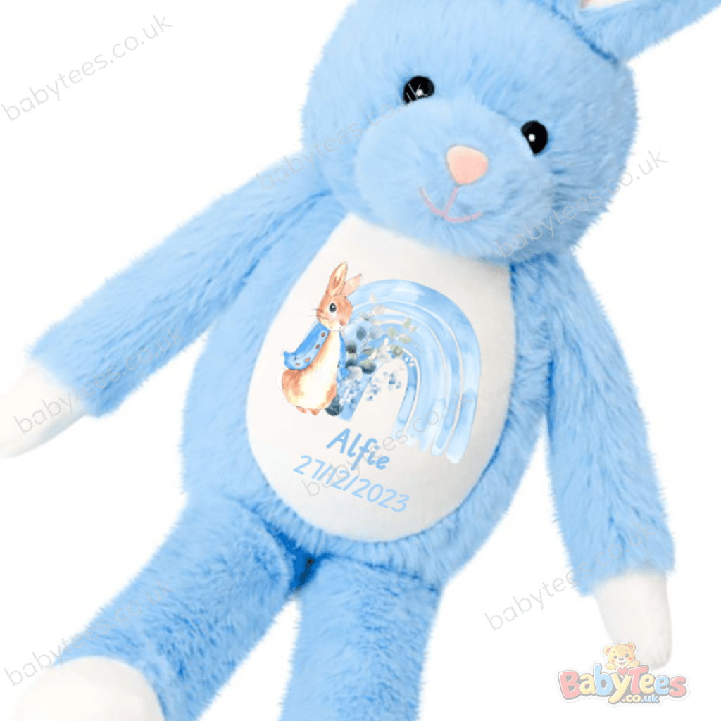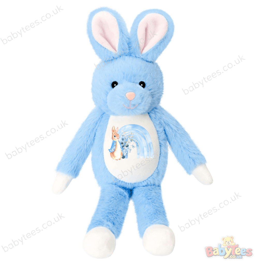 Personalised teddy gifting just got more beautiful — this soft blue bunny from the Tummi Bears Littles® collection features a charming printed design with a floral bunny wearing a blue scarf, a soft rainbow, and a bouquet of blue flowers 🌸🐰🌈.