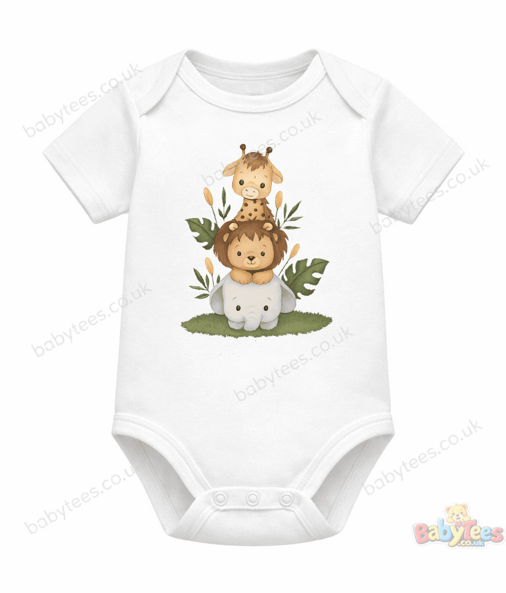 Bring the jungle to life with this charming Personalised Safari Animal Stack baby bodysuit, featuring a playful trio of baby animals — elephant, lion, and giraffe — surrounded by leafy greenery and topped off with your little one’s name in elegant script.