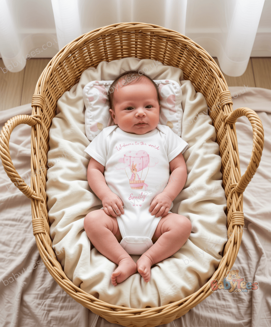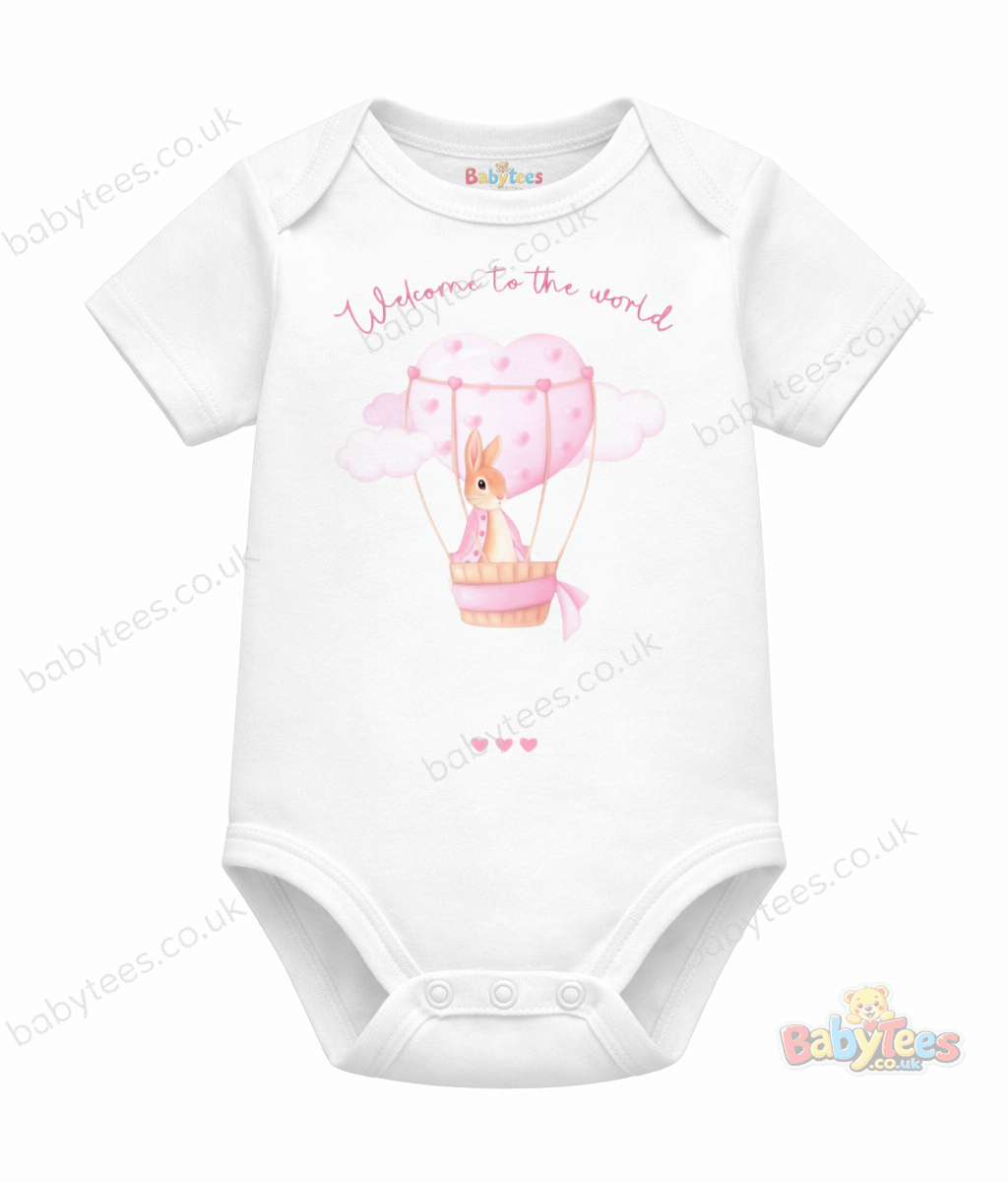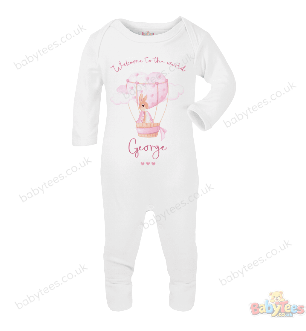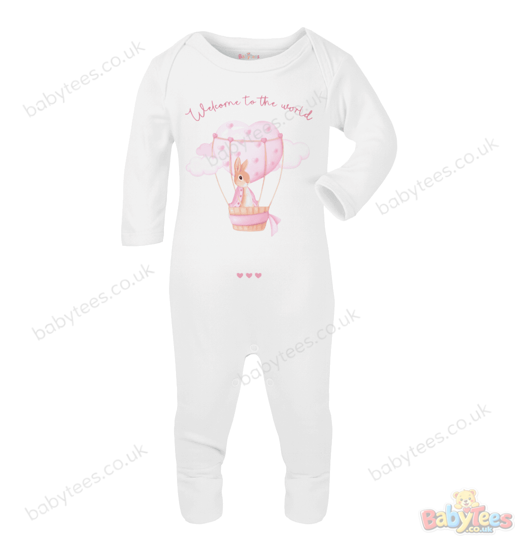 welcome to the world sleepsuit featuring a sweet rabbit 🐰 floating in a pink hot air balloon 🎈 surrounded by soft clouds ☁️ and tiny hearts 💖 — a gentle, dreamy design perfect for newborn gifting or first photos 📸.