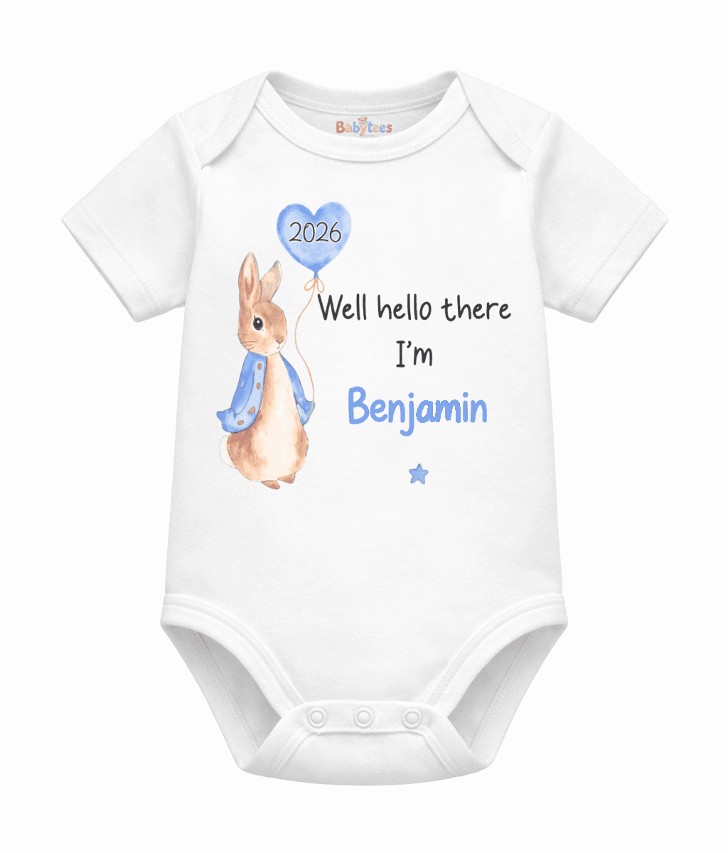 Adorable Personalised Baby Sleepsuit Well Hello There – Blue Bunny Balloon 2026 Design