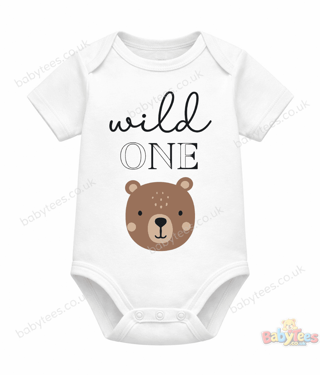 Let your little explorer roam free in our “Wild One” baby bodysuit, featuring a bold forest-inspired design and an adorable bear face beneath the text. Whether it’s for a first birthday, a woodland-themed photo shoot, or just a playful day out, this outfit celebrates your baby’s wild spirit with style.